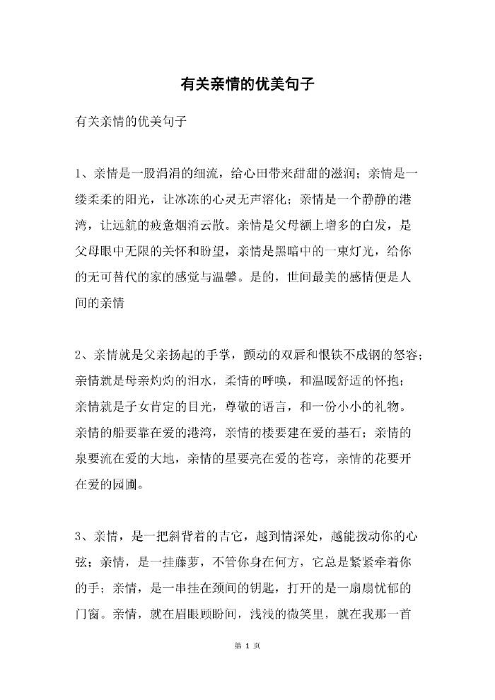 1、亲情,一股脉脉清泉从心田涌出,润遍全身,犹如如酥的小雨滋润大地,唤出一片初春的生机勃勃2亲情能滋润人的心田,使生命之舟洒满阳光它是一种隐藏在每个人内心深处的一种而深厚的情感,它可以冲破时间空间的阻碍。