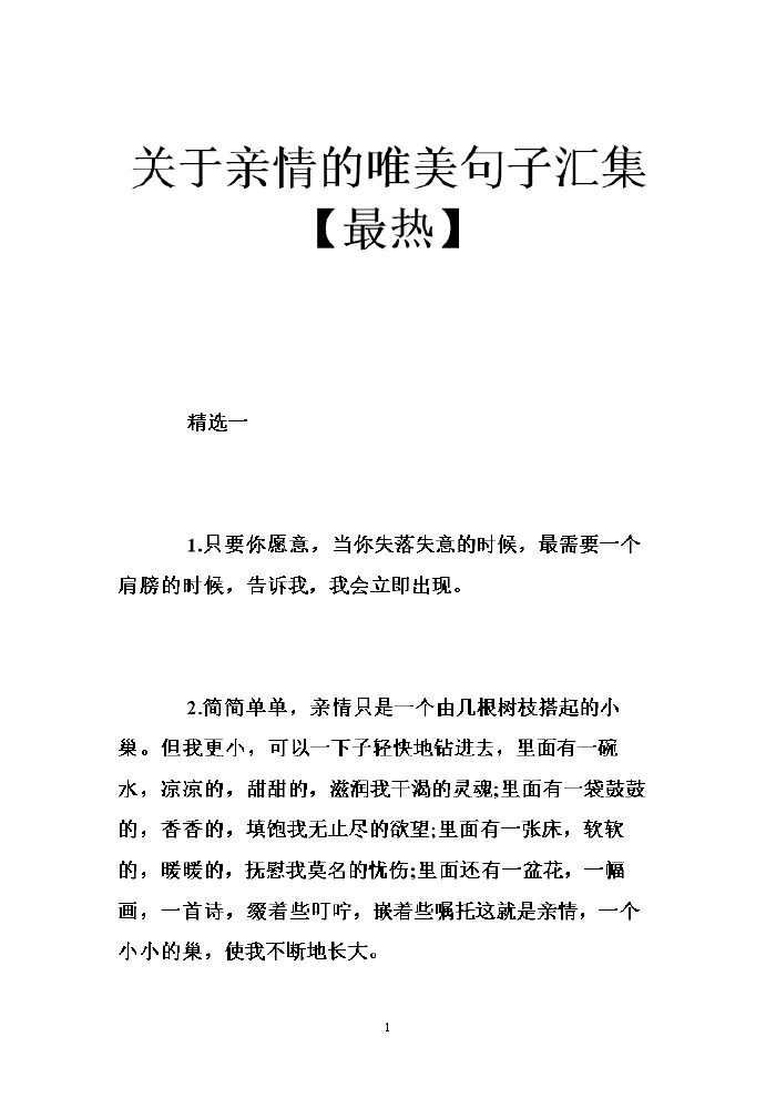 11、在最无助的人生路上,亲情是最持久的动力,给予我们无私的帮助和依靠在最寂寞的情感上,亲情是最真诚的陪伴,让我们感受到无比的温馨和安慰在最无奈的十字路口,亲情是最清晰的路标,指引我们成功到达目标#x00A0 2简简单单,亲情只是。