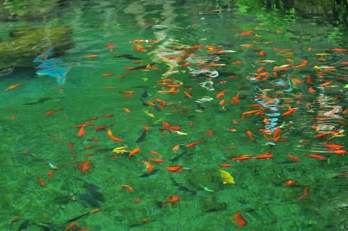 5、红鲤鱼宛如一块块红绸在水面上下舞动。