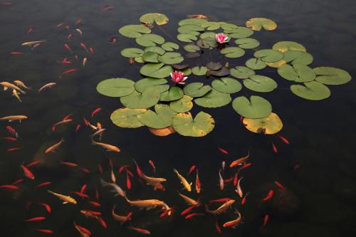 15、水中红色的鱼儿自由自在地来回游动。