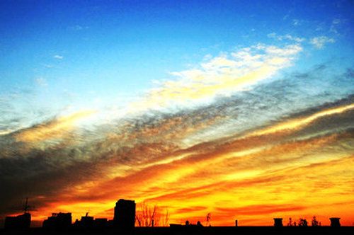 7、天空的色彩真是美妙呀!近处一片橙色,西边一片红色,把深蓝色的天空映照得格外艳丽。