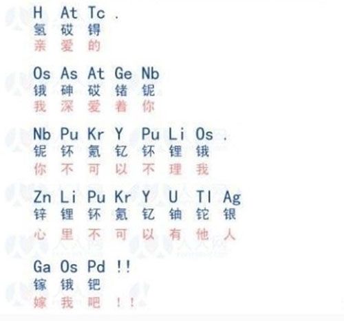 11,学习化学儿童是非常隐性的忏悔:H在TC .os处于Gen。 Nb pu kr y pu li os。 zn li pu Kr Y U Tl Ag .ga OS PD! ! !这很容易翻译,含义:亲爱的,我深深地爱你,你不能忽视我,你不能让你心中的任何人,嫁给我! ! !
