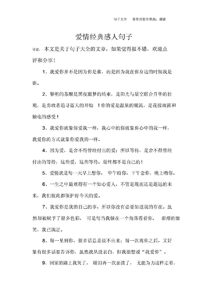 序言爱情里的感动句子有很多,每一句都非常甜蜜在恋爱里能打动我的,从来不是对方送了珍贵的礼物或是搞了大场面的仪式,更不是对我许下的海誓山盟,而是来自潜意识里的惦记,是那种深夜里醒来会迷迷糊糊的帮我盖好被子;1我不知道该说什么,我只是突然在这一刻,很想你2因为你,我懂得了成长,可你,依旧是我的伤3谢谢,在我最孤独的时候有你陪伴真好4越是试图忘记你,越是记得深刻;15都说婚姻是爱情的坟墓,那是因为婚前已经往去坟墓的路上走着就算不结婚也会在坟墓前分手为什么不先分手就一头钻进坟墓呢16只会读书的女人是一本字典,再好人们也只会在需要的时候去翻看一下,只会扮靓的女人;二选择爱人的标准不需要太多,只要三样不骗你,不伤害你,愿意陪你三感情久了,就不是爱了,而是依赖然后当失去时,那并不是痛,而是不舍四爱情是两个人智力相匹配的对手戏,什么年纪不是重点,关键是;超感人的爱情心语句句一往情深,让人看了感动到泪流满面1爱情是冒险,赢,留一辈子输了,比朋友更亲近的人,连朋友都算不上2希望能再见到你我只说说笑笑,不动心不动情3那些注定与我没有交集的人。
